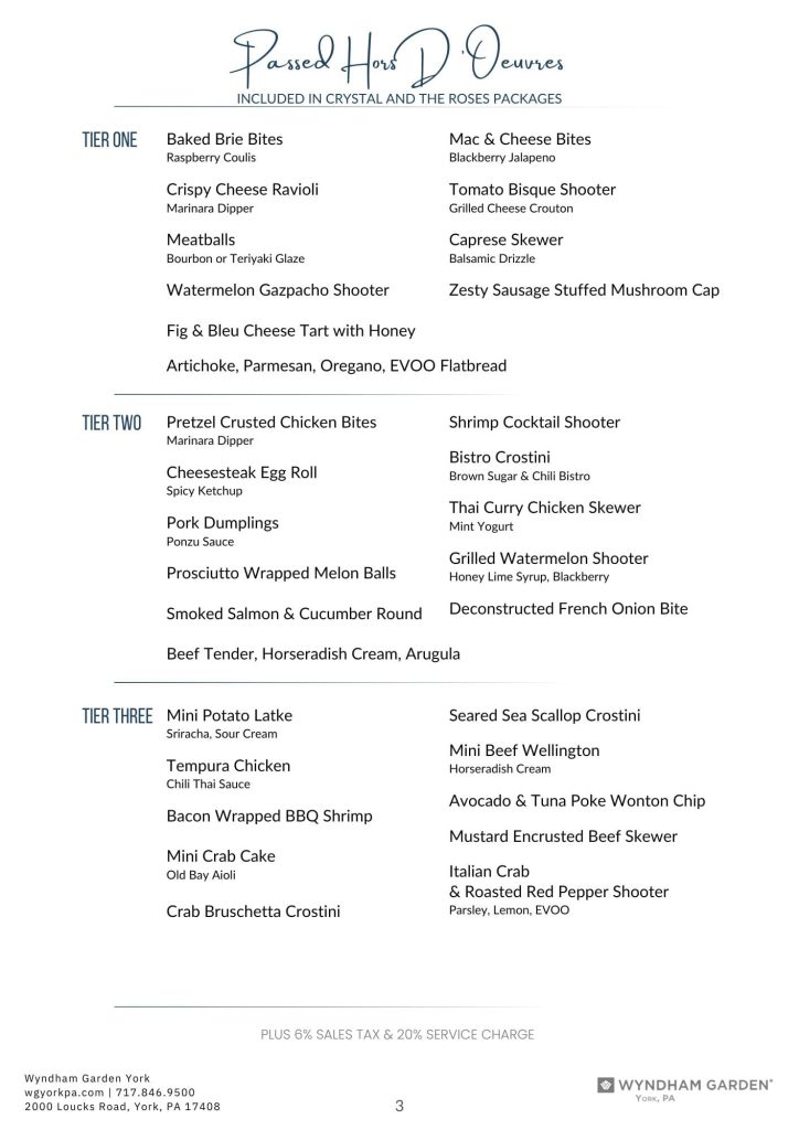 The Tier One, Tier Two, and Tier Three passed hors d’oeuvres selections at Wyndham Garden York offer an exquisite array of gourmet bites, ranging from Baked Brie Bites with Raspberry Coulis and Crispy Cheese Ravioli to more sophisticated options like Prosciutto Wrapped Melon Balls, Mini Crab Cake with Old Bay Aioli, and Mustard Encrusted Beef Skewer. These tiers include a diverse palette of flavors, such as the sweet and savory Fig & Bleu Cheese Tart with Honey, the refreshing Watermelon Gazpacho Shooter, and the elegant Seared Sea Scallop Crostini, ensuring a luxurious and memorable culinary experience included in the Crystal and The Roses packages.